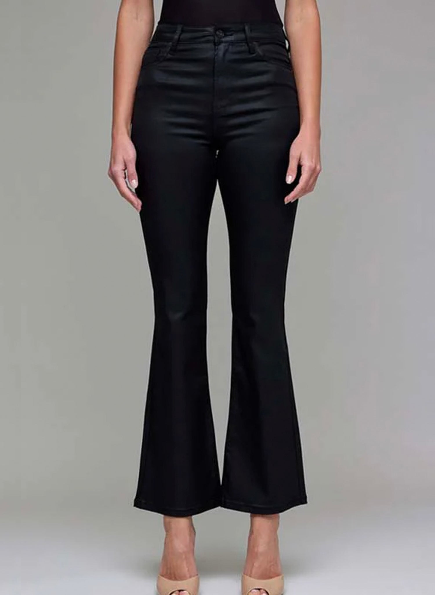 Rock a silhouette that's equal parts bold and wearable with these high-rise flare jeans. The coated black denim brings serious edge—think sleek, sophisticated, and ready for anything from coffee runs to night out. A flattering high-rise waistband lengthens your legs while the flared hem adds that fashion-forward flair everyone's talking about. The premium coating keeps that polished finish looking fresh, season after season. Whether you're dressing them down with sneakers or up with heels, these jeans are your new go-to for making an effortless statement.