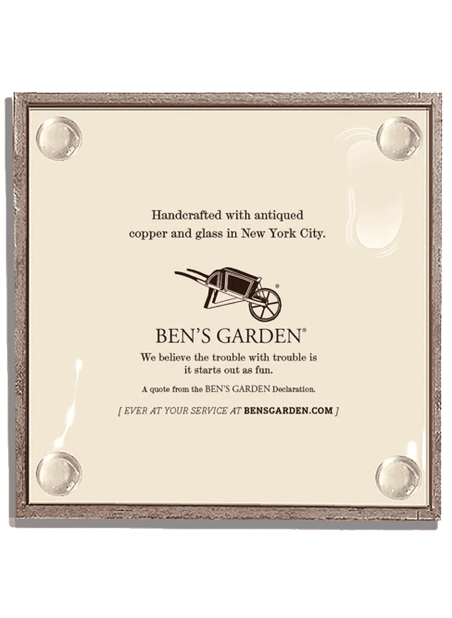 Bring a touch of New York artistry to your table with this charming set of four coasters. Each piece pairs elegant antiqued copper with pristine glass, featuring classic typography on a natural backdrop. Protective plastic bumpers keep your furniture safe while you entertain in style. Wrapped in sophisticated pewter grosgrain ribbon and presented in Ben's Garden's signature gift box, these handcrafted treasures are ready to impress—whether you're treating yourself or delighting someone special.