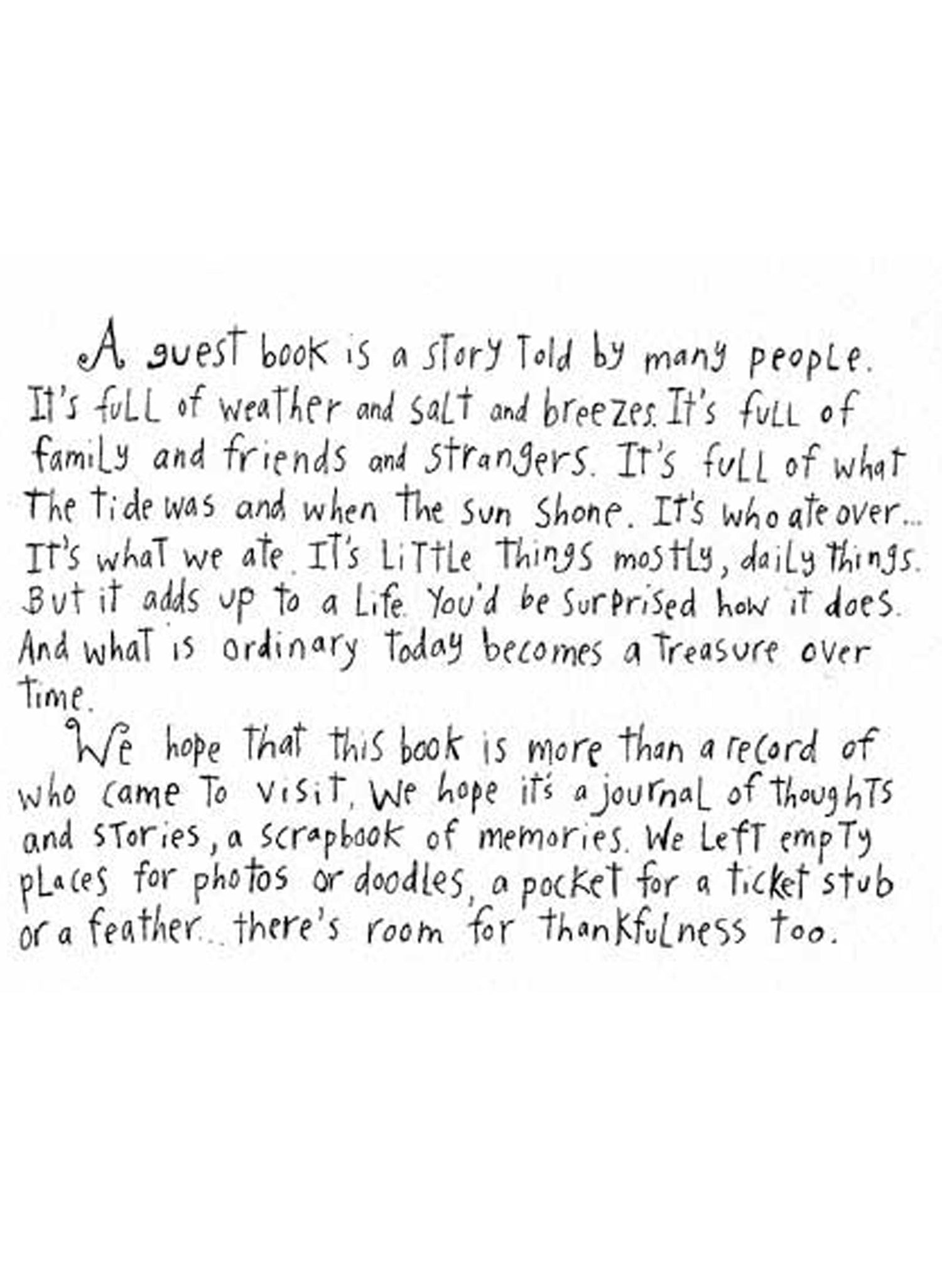 How to keep track of all those people leaving sandy footprints in your life? With this clever guestbook that allows visitors to leave their own lasting impressions of the shore. Includes a pocket for mementos, and is bound to lay flat.