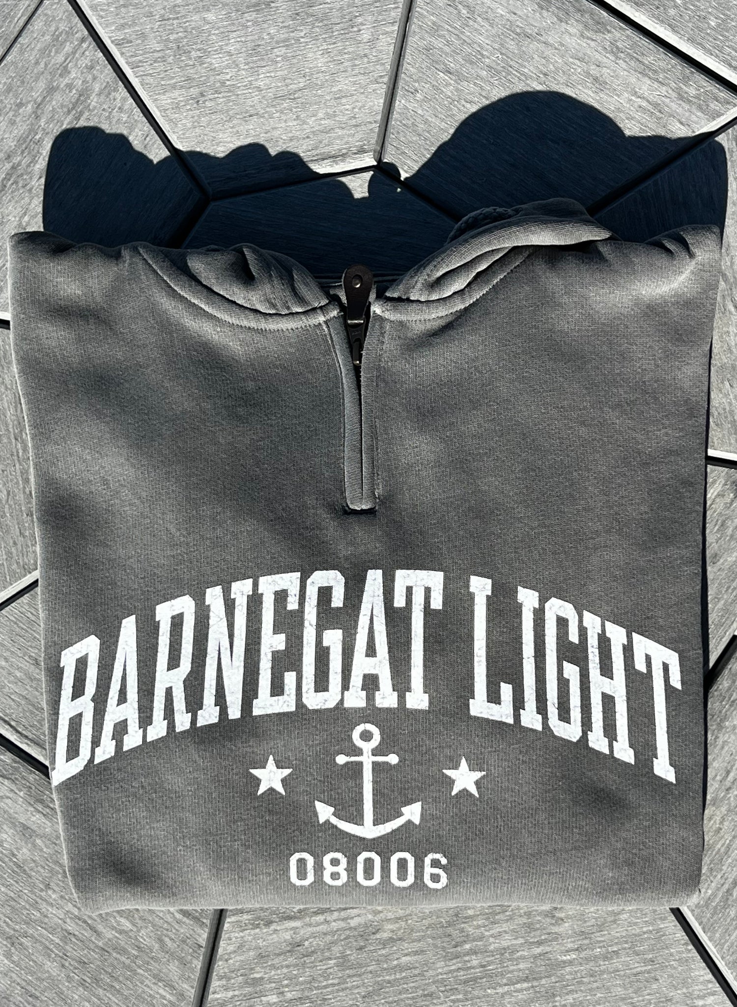 Rock that coastal charm with this smoke colored hooded minizip sweatshirt, featuring a classic Barnegat Light 08006 print on the front. Crafted from a cozy cotton-poly blend (80% cotton, 20% polyester), it's the perfect layer for breezy beach days or casual hangouts. Comfort meets style in this laid-back essential.