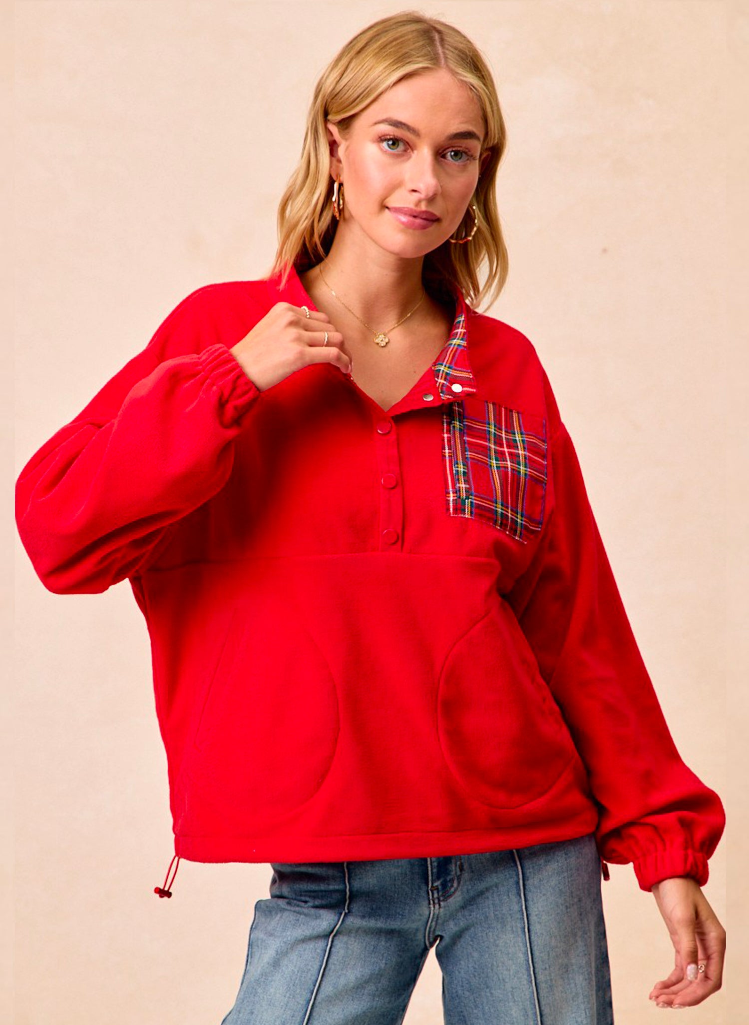 Get cozy this holiday season with our Christmas Theme Fleece Buttoned Top in festive red. Made from 100% soft polyester fleece, it’s perfect for keeping warm on chilly winter days. Featuring convenient pockets and easy button closures, this top blends comfort with practicality. Whether you're sipping hot cocoa or wrapping gifts, its playful holiday vibes will keep your spirits bright and your style merry. Perfect for lounging at home or adding a splash of cheer to any casual outing. Embrace the season with warmth and fun in this charming festive top!