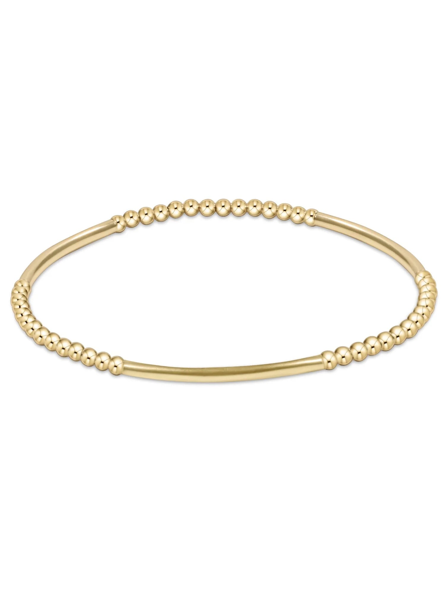 Discover a fresh spin on our bliss bar gold bracelet! Crafted with tiny 2.5mm, 14kt gold-filled beads, this little gem is worry-free—wear it all day and night, even when you sleep, shower, or sweat. Hand-beaded on stretchy high-performance elastic, it slips on effortlessly and hugs your wrist just right. Measuring 6.25", it’s perfect for stacking with your favorite bracelets for a playful, layered look.