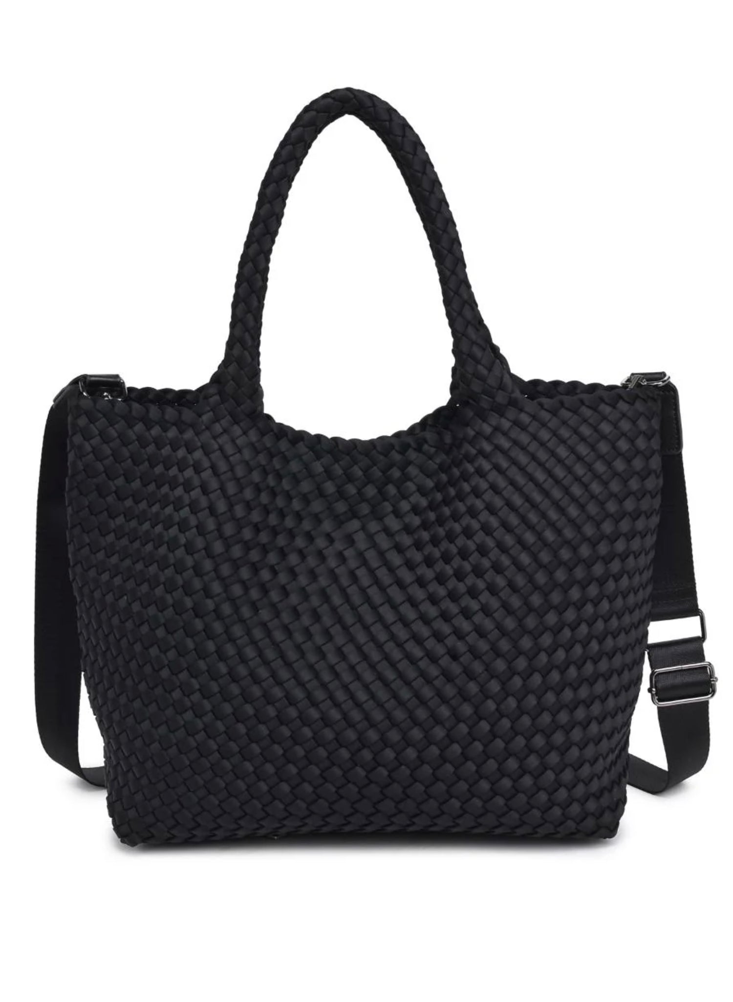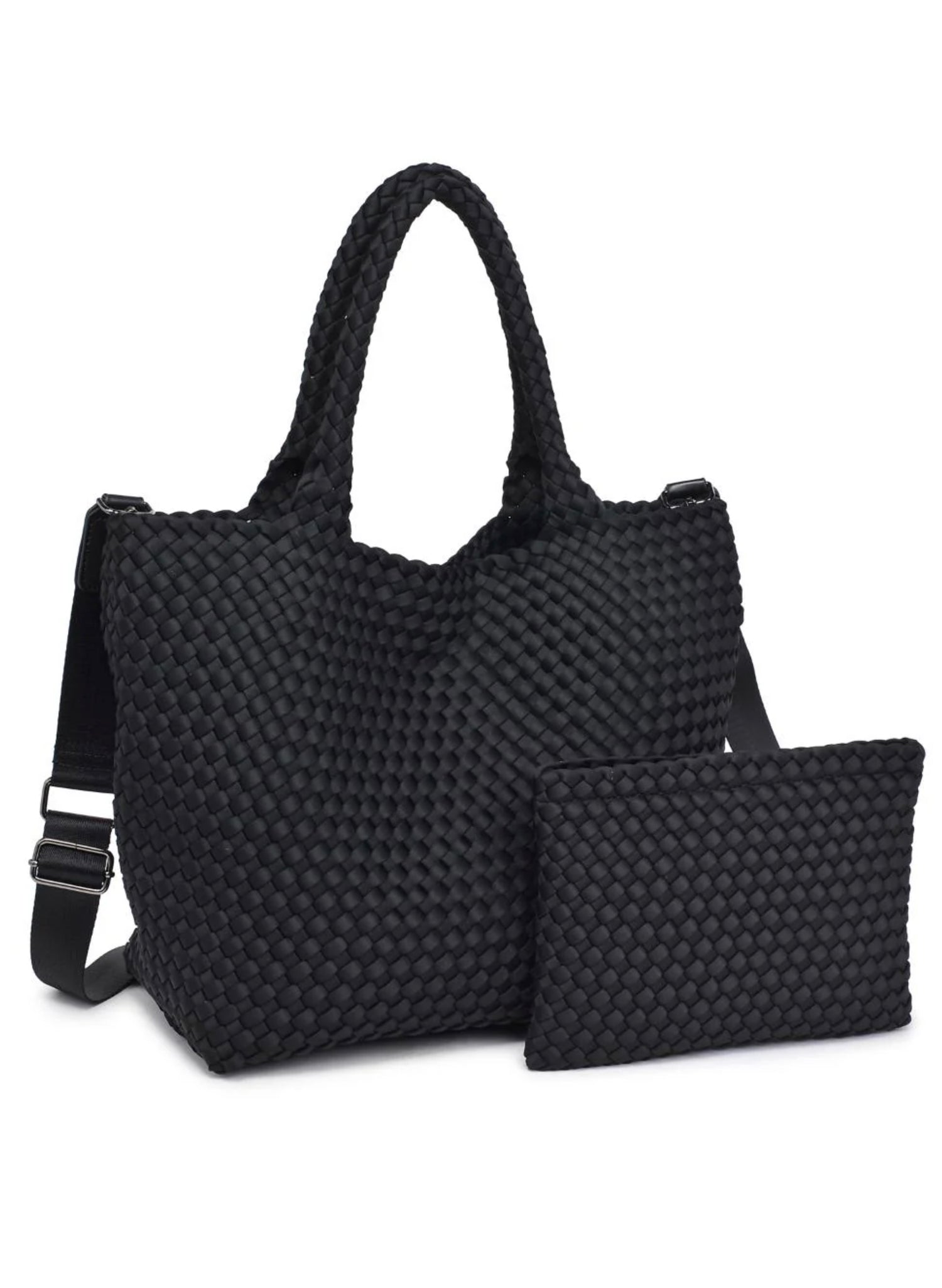 When you’re breaking through ceilings and chasing dreams, you need a bag that can keep up. The Sky’s The Limit tote is roomy enough for your gadgets, snacks, journals, and all your ambitions. Wear it crossbody or on your arm—it stays light and ready to carry you through the day. Made from neoprene with a snap closure, featuring a woven exterior, a 7" handle drop, and an adjustable strap between 18" and 29". Inside, find an open space plus a removable zipper pouch. Size: 12” L x 6.5” W x 12” H.