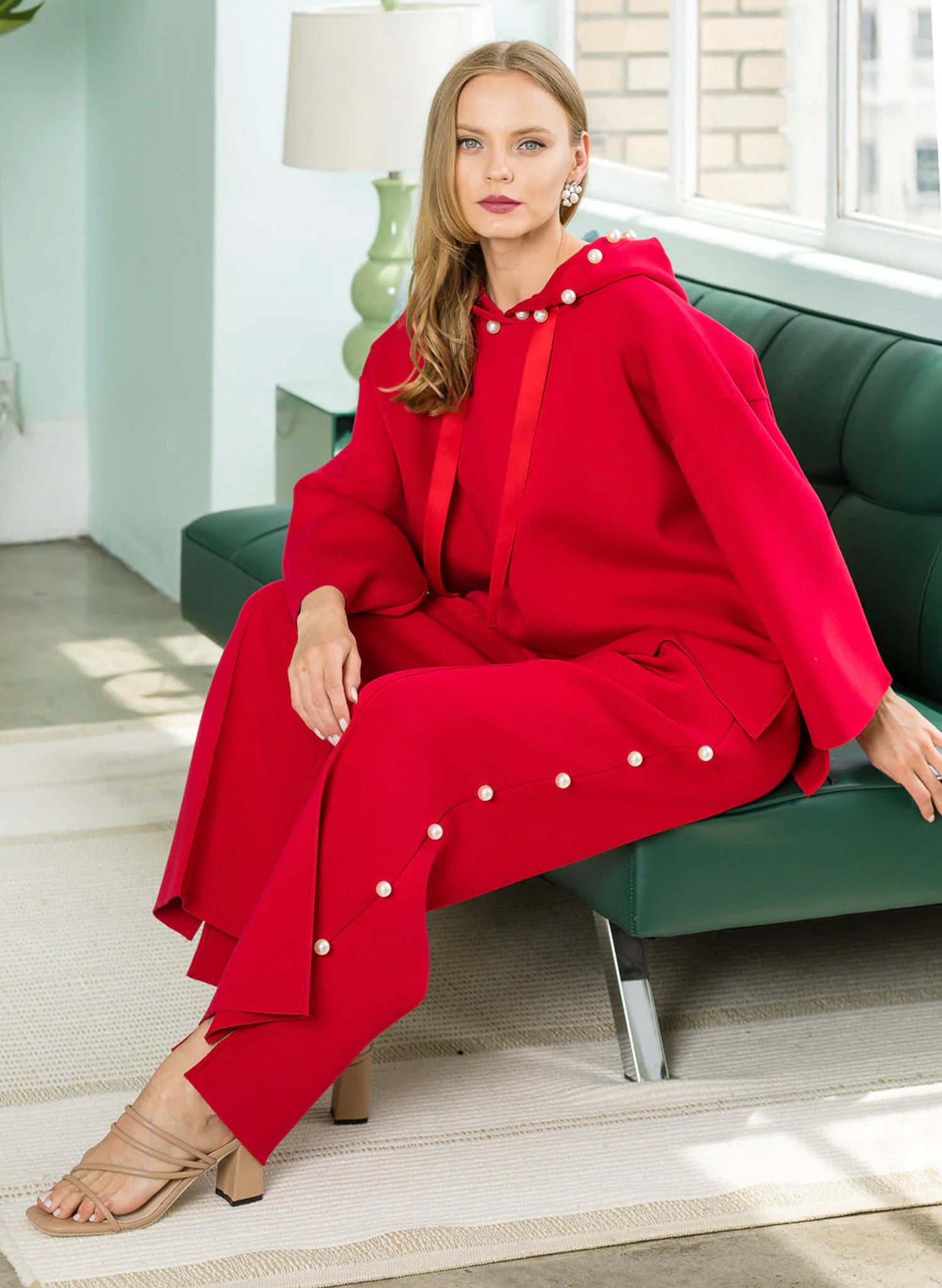 Meet the Farrah Pearl Pant in Red, crafted from luxe French scuba fabric that flows and flatters with a gentle flare. Adorned with charming pearls along the sides, these pants bring a playful yet chic vibe to any outfit. Cozy, soft, and easy to wear with an elastic waistband and handy side pockets, they offer a relaxed fit that feels as good as it looks. Mix and match with the Francine pearl hoodie or Katri and Keda pearl tops for an effortlessly stylish, season-proof ensemble.