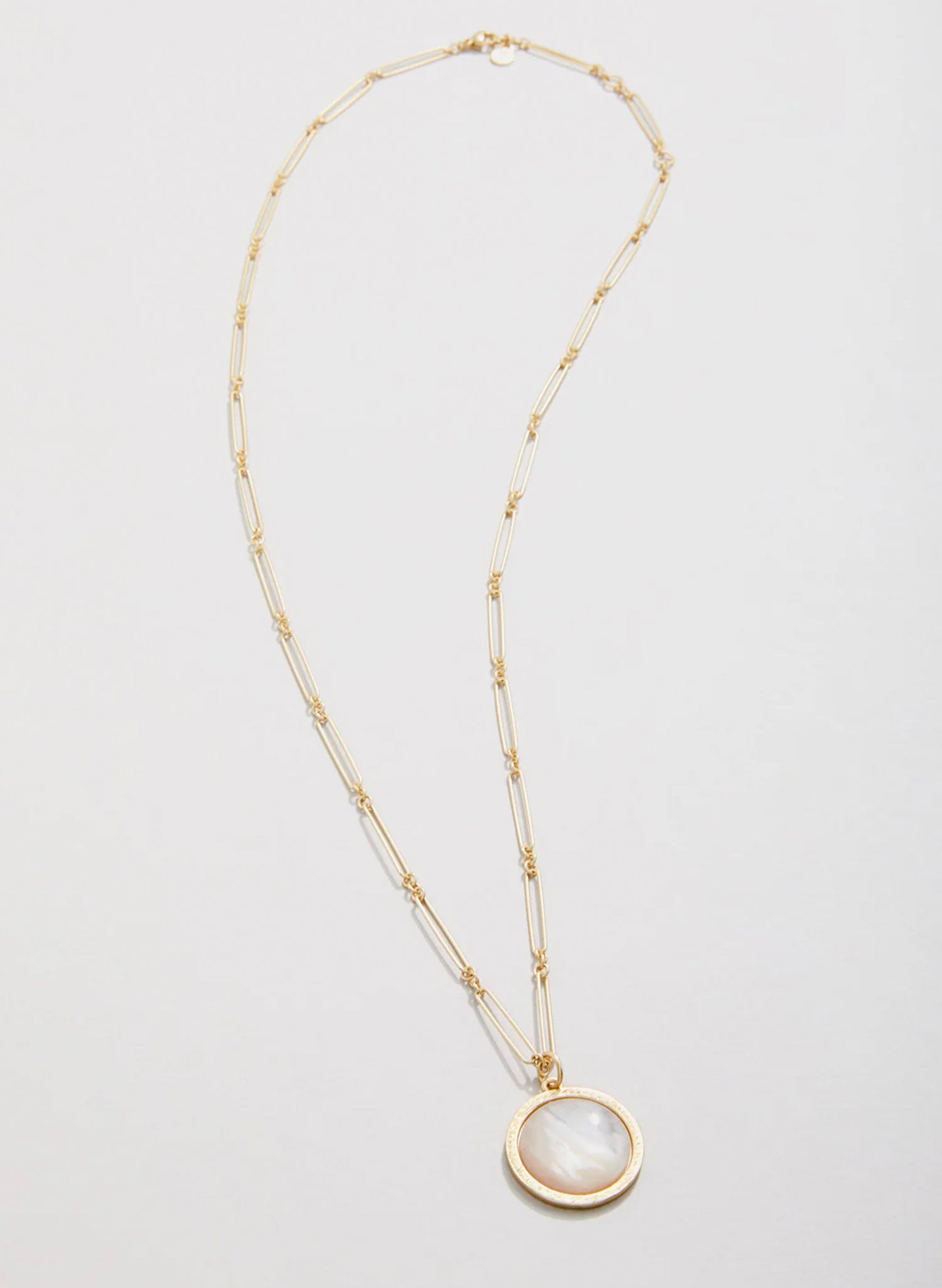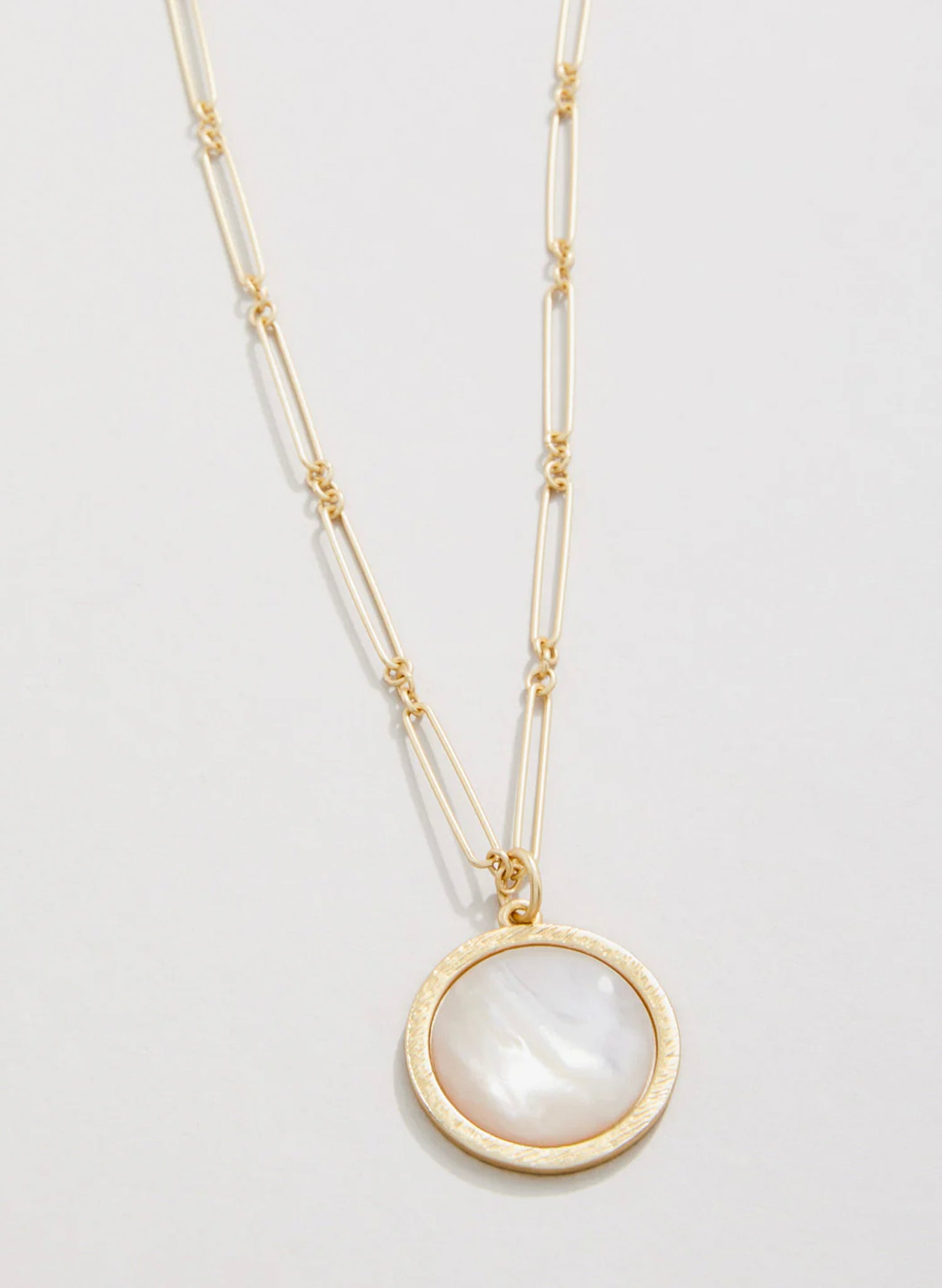 Elevate your everyday style with the Franklin Necklace, where iridescent mother-of-pearl meets warm golden elegance. This 24" stunner pairs a luminous pendant with a textured golden frame, all suspended on a delicate matte gold paperclip chain that catches the light just right. Whether you're dressing up or keeping it casual, this versatile piece transitions seamlessly from day to night. The secure lobster closure and adjustable 2.5" extension ensure the perfect fit every time. A timeless treasure that deserves a permanent spot in your jewelry rotation.