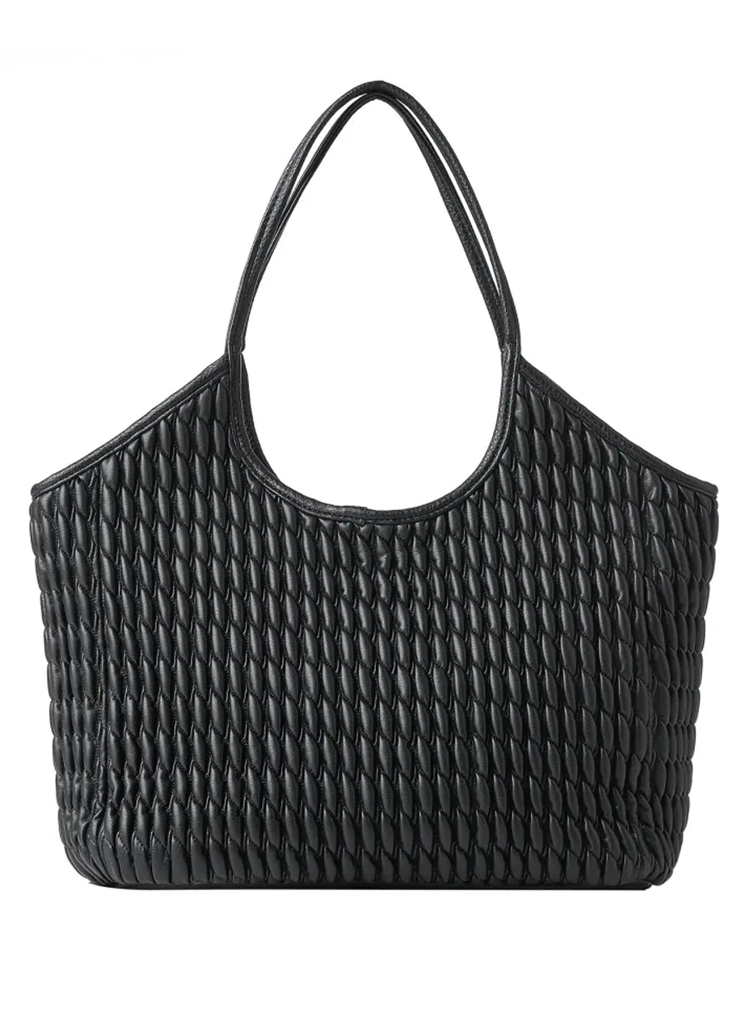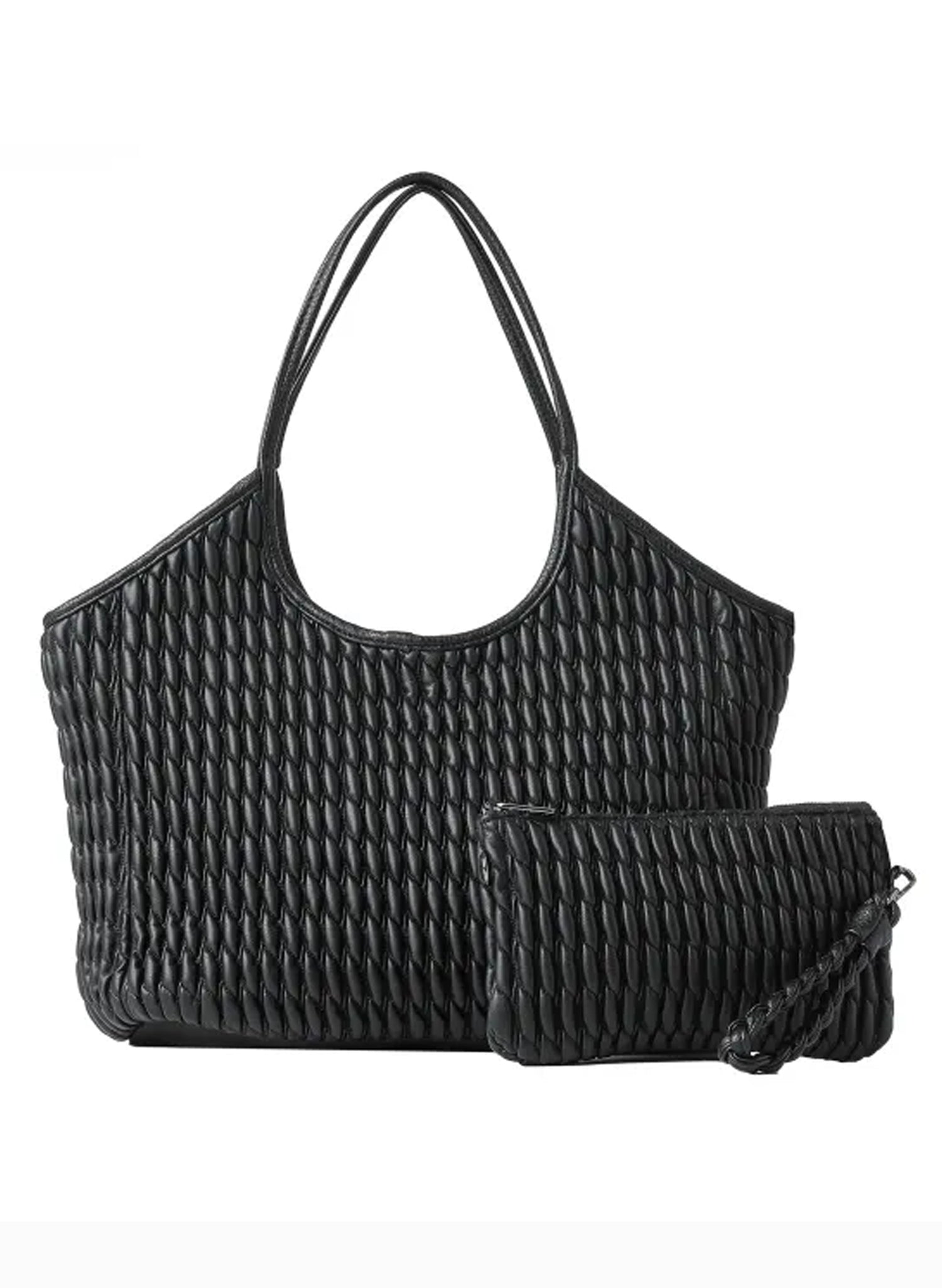 This fun and fashionable tote sports a puckered vegan leather surface for an on-trend vibe. Measuring 14 inches long by 14.5 inches tall, it’s roomy enough for all your must-haves. A zipper keeps everything secure, and the detachable wristlet pouch is perfect for those quick trips out. Whether you’re headed to work or weekend escapades, this tote effortlessly blends style and practicality. Featuring a sleek black exterior, zipper closure, and an 8.5-inch strap drop, it’s as versatile as it is cute!