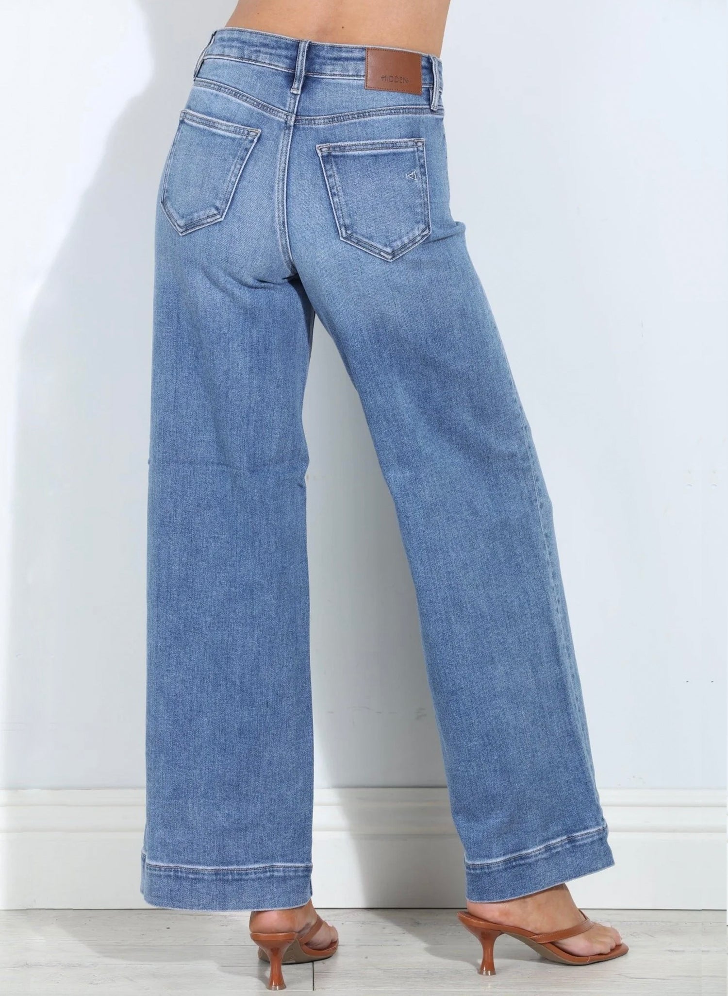 Meet your new favorite denim staple—the Nori wide-leg jean in a flattering medium blue. Crafted from a comfortable cotton-blend fabric with just enough stretch to move with you, these high-waisted beauties feature a 31" inseam and roomy wide legs for that effortlessly cool vibe. Practical front pockets keep your essentials close, while the elevated fit works magic on your silhouette. From Hidden Jeans, because great denim should feel as good as it looks.