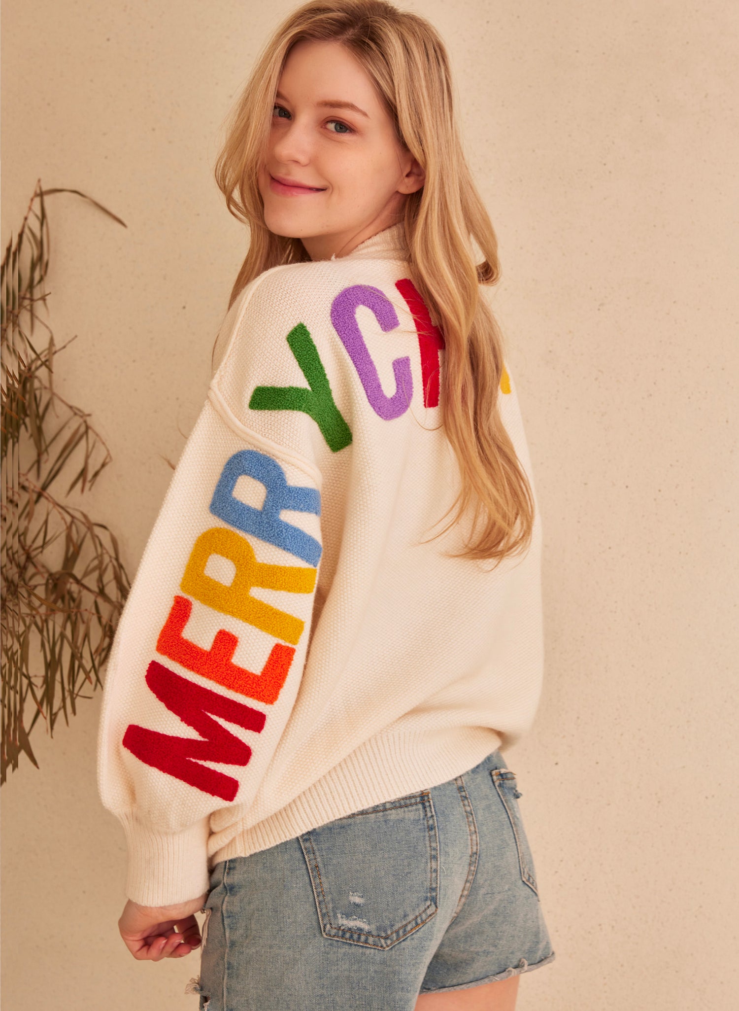 Celebrate the season in cozy style with the Holiday Cheer Sweater. Featuring fun, oversized letters and a comfy relaxed fit, this knit instantly lifts your winter spirit. Whether you’re cozying up with hot cocoa or joining a festive gathering, this sweater adds extra sparkle to your holiday fun. Highlights include a soft, snuggly fabric, vibrant “Ho! Ho! Ho!” on the front, festive “Merry Christmas” designs on the back and sleeves, plus snug ribbed edges for all-day comfort. It’s the perfect playful piece for spreading cheer.