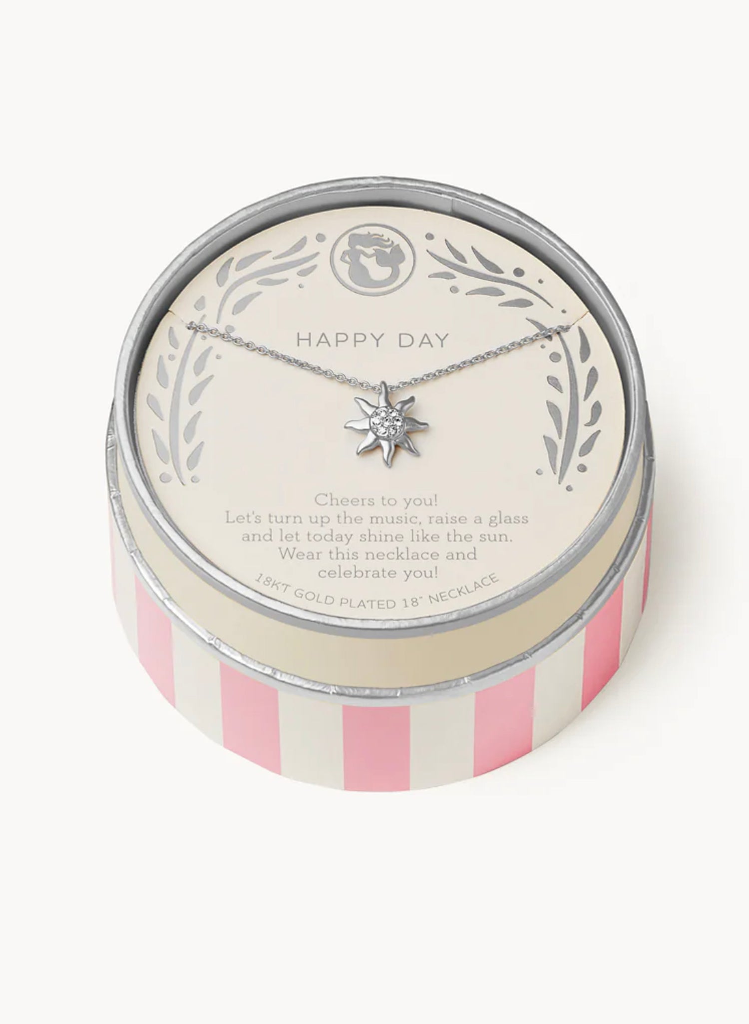 Celebrate yourself with our Happy Day Necklace, featuring a cheerful sun charm. This delightful piece arrives in a charming box with the message: "Cheers to you! Let’s crank up the tunes, toast to the moment, and let your day shine bright like the sun. Wear this necklace and celebrate the amazing you!"