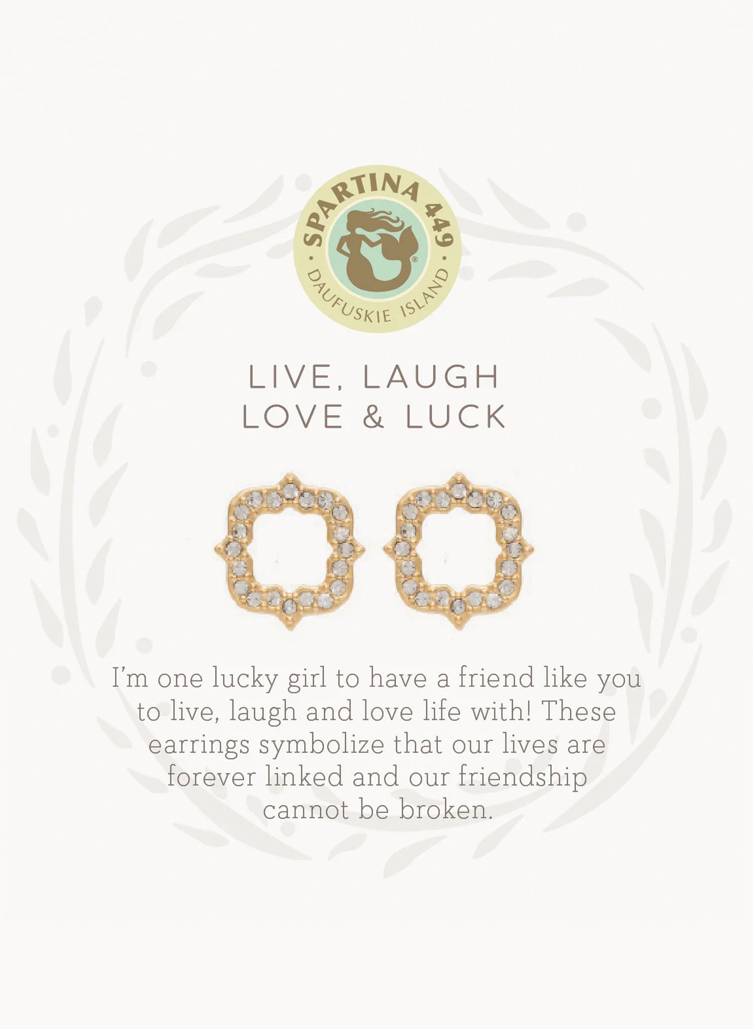 These charming stud earrings celebrate friendship with a delightful quatrefoil design that's equal parts meaningful and fun. Crafted with 18kt matte gold plating and adorned with sparkling crystal gems, they're the perfect way to carry a reminder of your favorite people with you. Each pair arrives in an elegant gift box featuring an uplifting message about living, laughing, and loving together—making them an ideal present for your ride-or-die bestie. Petite and perfectly proportioned at 0.5" x 0.5", these studs slip seamlessly into any jewelry rotation.
