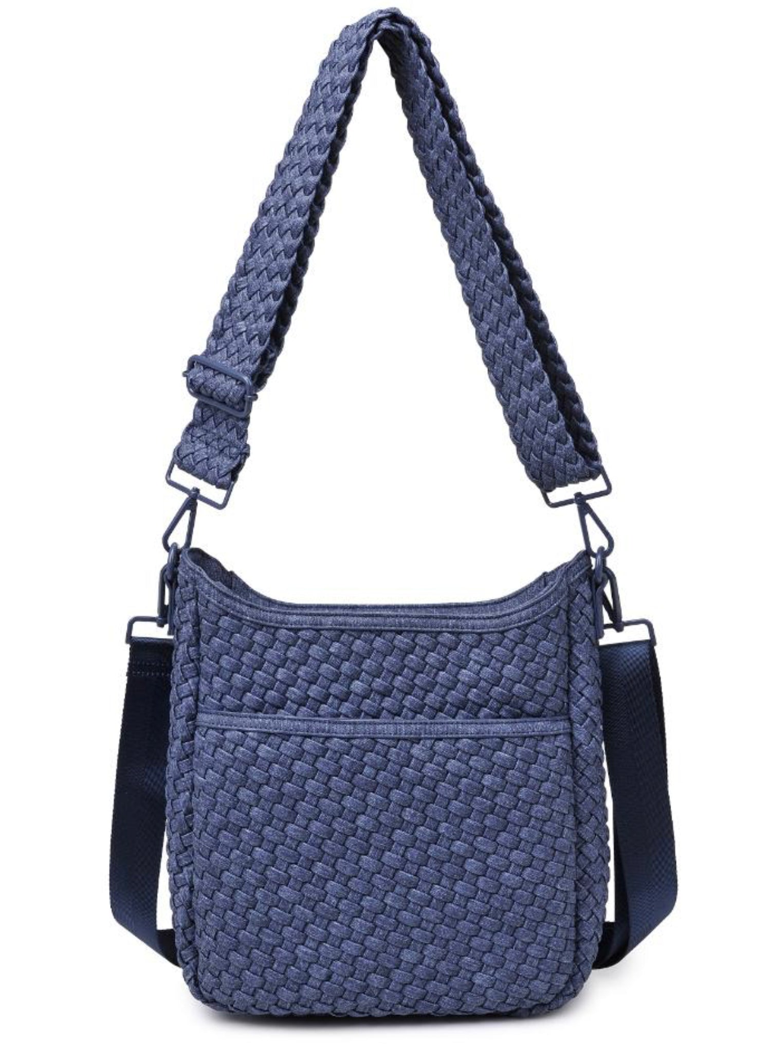 Meet the Kismet Neoprene Crossbody—a fun mix of fashion and function! Its woven dark denim exterior with matching hardware and handy front slip pocket keeps you ready for anything. Inside, water-resistant nylon lining shields your belongings, with one zip pocket and two slip pockets to keep things tidy. Sized perfectly at 11.75” L x 3.125” W x 10.375” H, this crossbody comes with two adjustable straps to fit your style and pace. Ready, set, go!