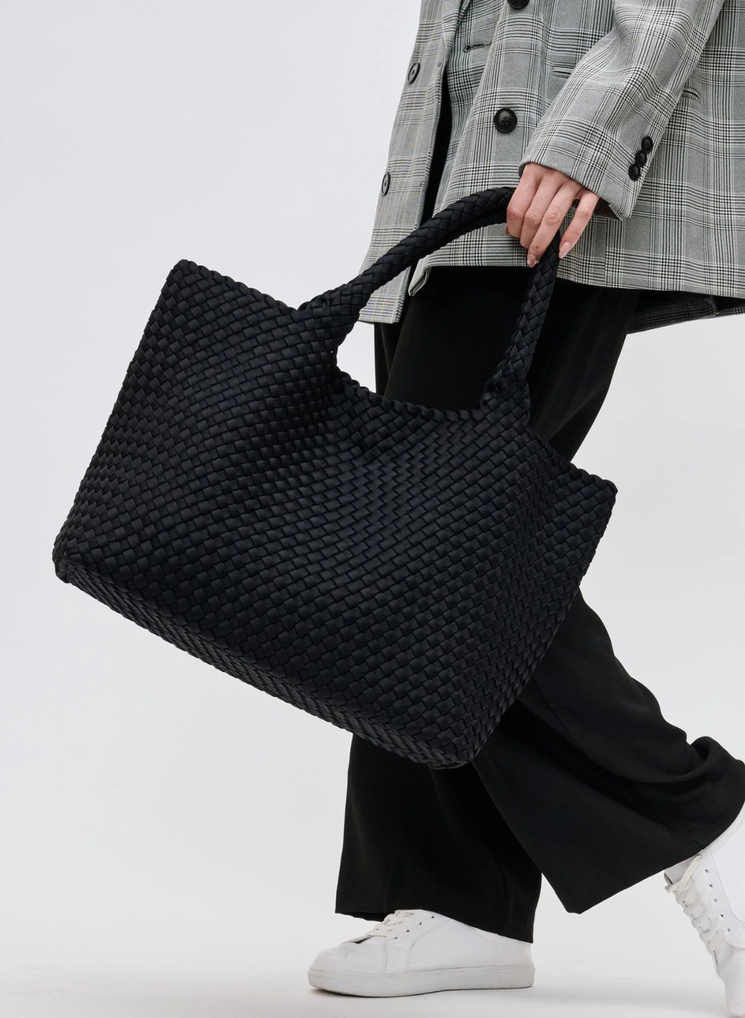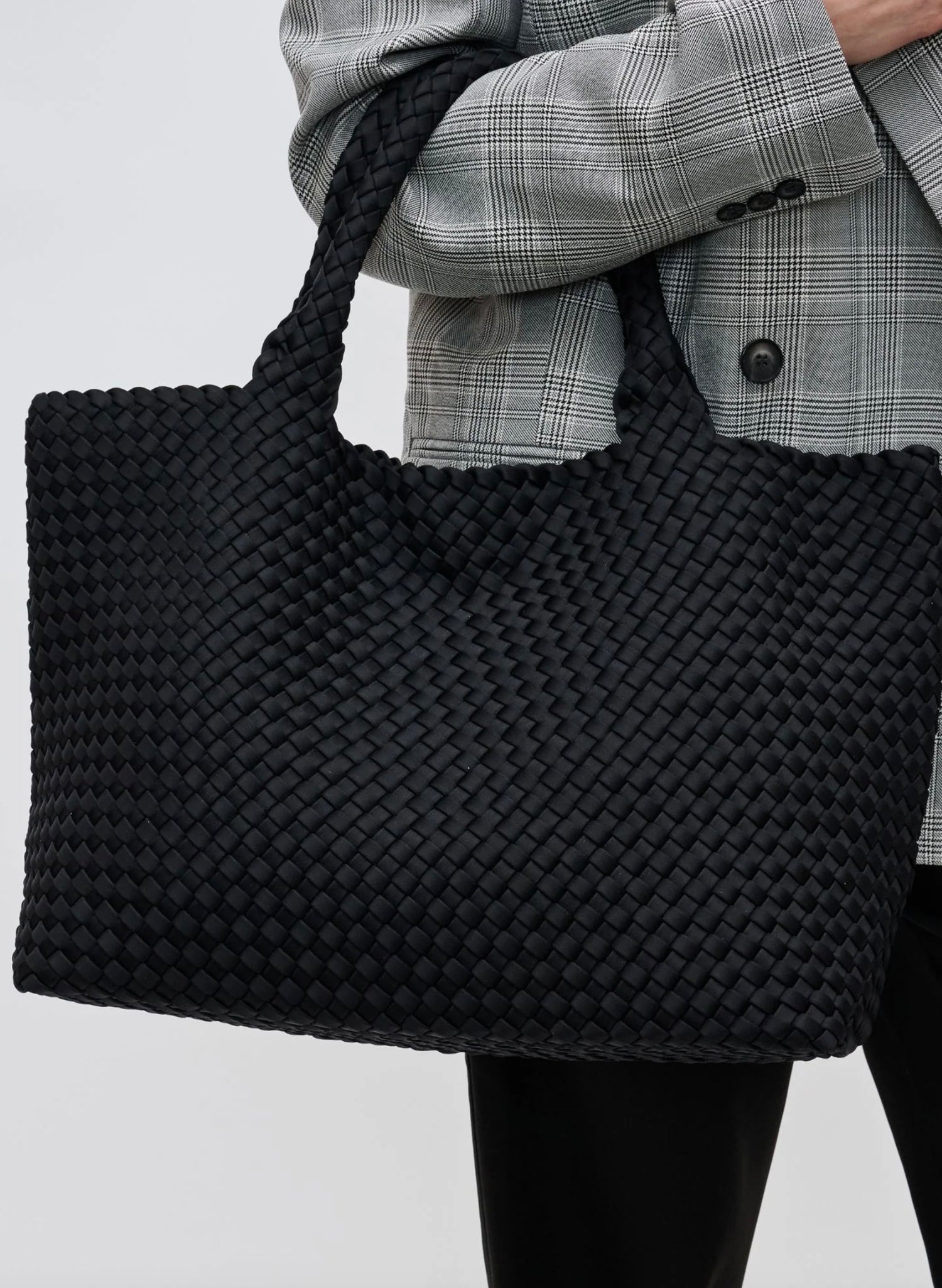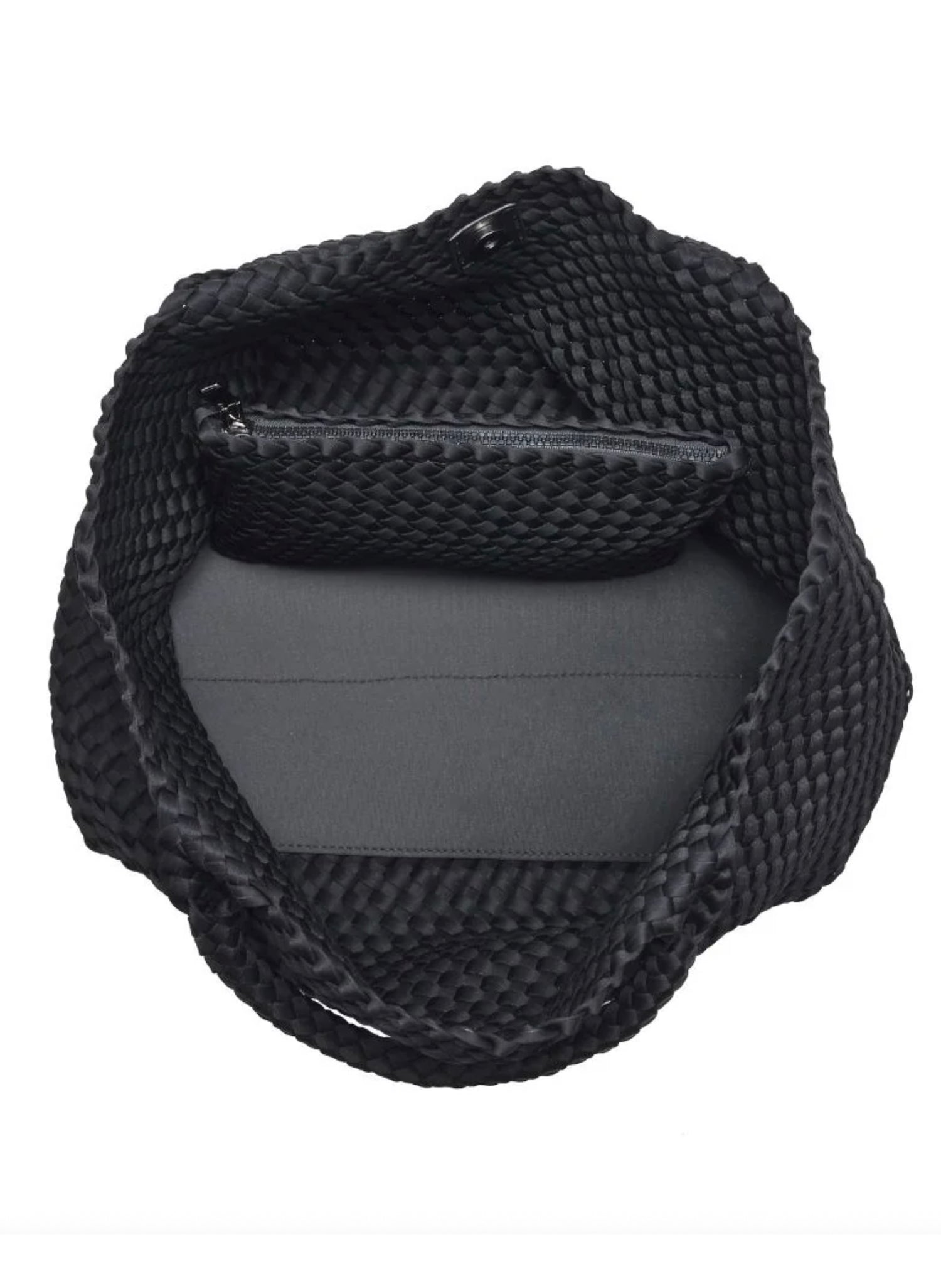 Dream big with the Sky’s The Limit large tote, designed to carry all your ambitions from workdays to weekends. This chic, black woven neoprene bag comes with a detachable pouch, perfect for quick errands or casual strolls. Spacious and stylish, it keeps your essentials neat while encouraging you to reach for the stars. Featuring a snap closure, 7” handle drop, and measuring 15” L x 8” W x 11.5” H, it's your go-to companion for any adventure.