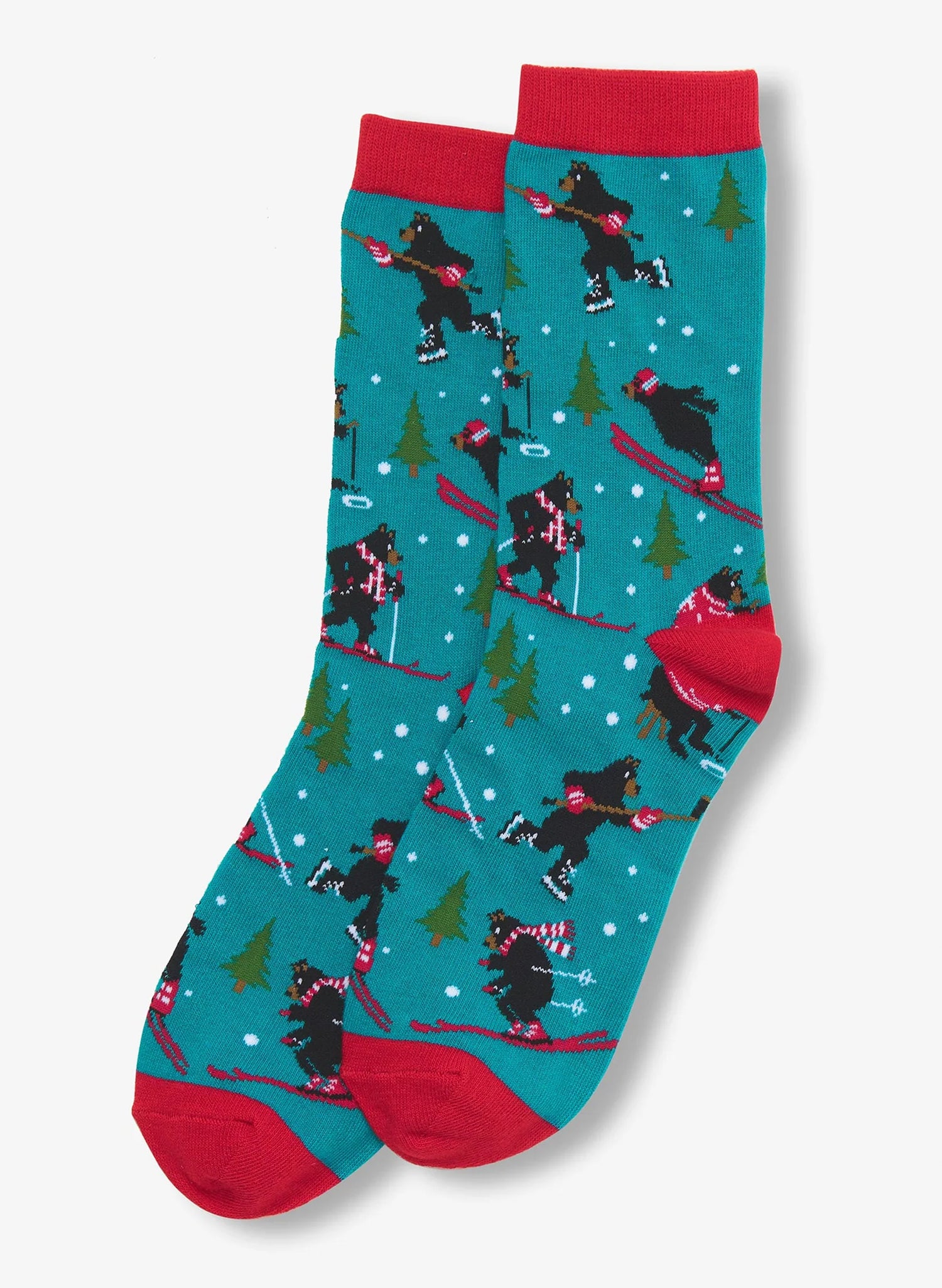 Embrace the season in style with these Wild Winter crew socks, crafted from a plush cotton-spandex blend that feels amazing against your skin. Featuring a spirited winter sports motif, they bring personality and charm to your everyday essentials. The supportive, all-day comfort makes them perfect for lounging through cold months or gifting to someone special. Whether you're bundling up or filling stockings, these playful socks deliver warmth with a wink.