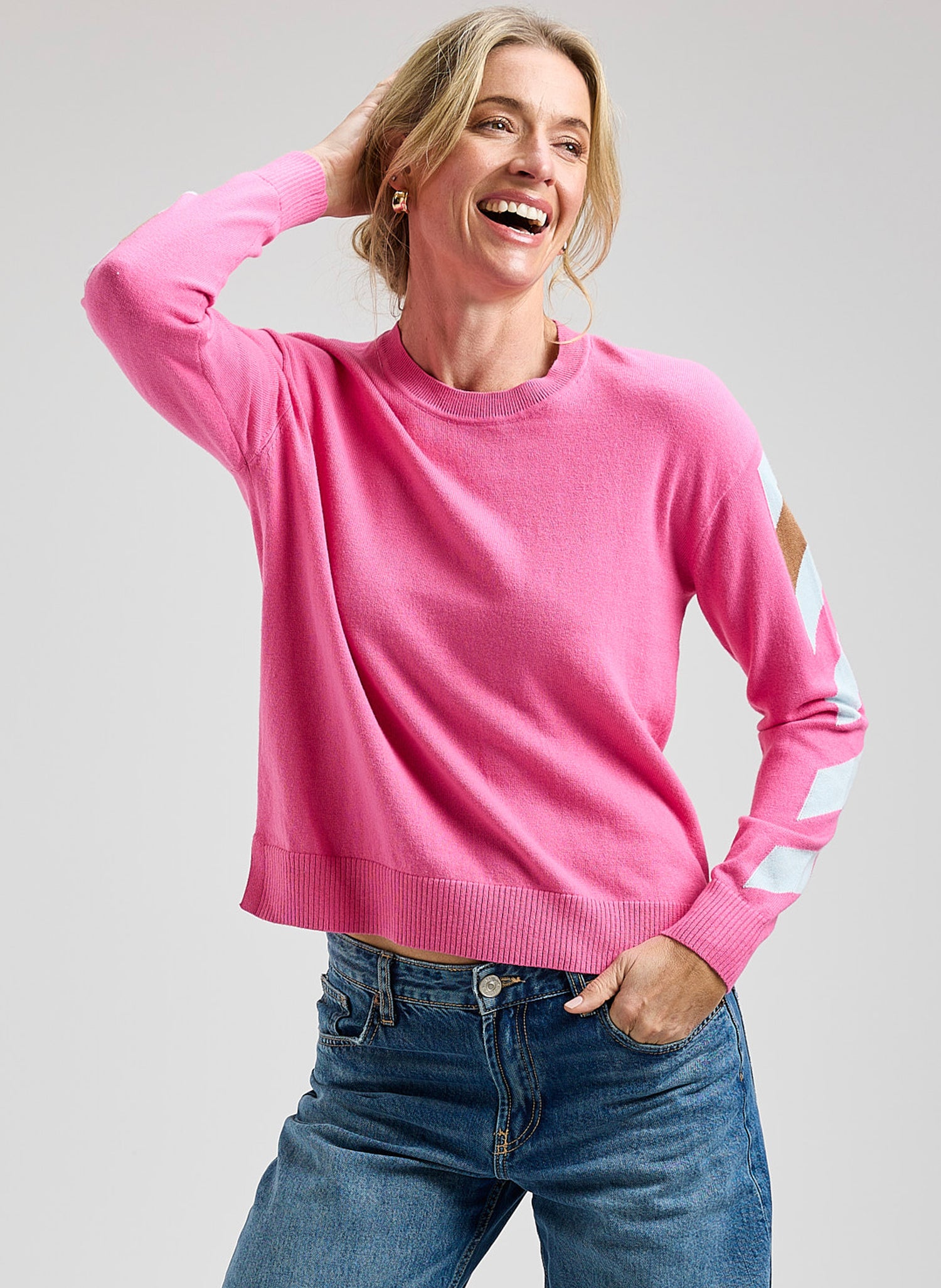 Meet your new spring essential: the Zaket & Plover Arm Band Sweater in Bubblegum. This lightweight navy knit strikes the perfect balance between laid-back and put-together with its relaxed, boxy silhouette and effortless crew neckline. Drop shoulders keep things comfy, while diagonal contrast stripes down the sleeves bring a fun, sporty vibe that actually makes a statement. A cheeky side slit adds movement and flow without trying too hard. Whether you're pairing it with your favorite jeans or dressing it up for something more intentional, this sweater plays well with everything. It's the kind of piece that feels like a hug and looks like you totally have your style figured out. 95% Cotton 5% Cashmere