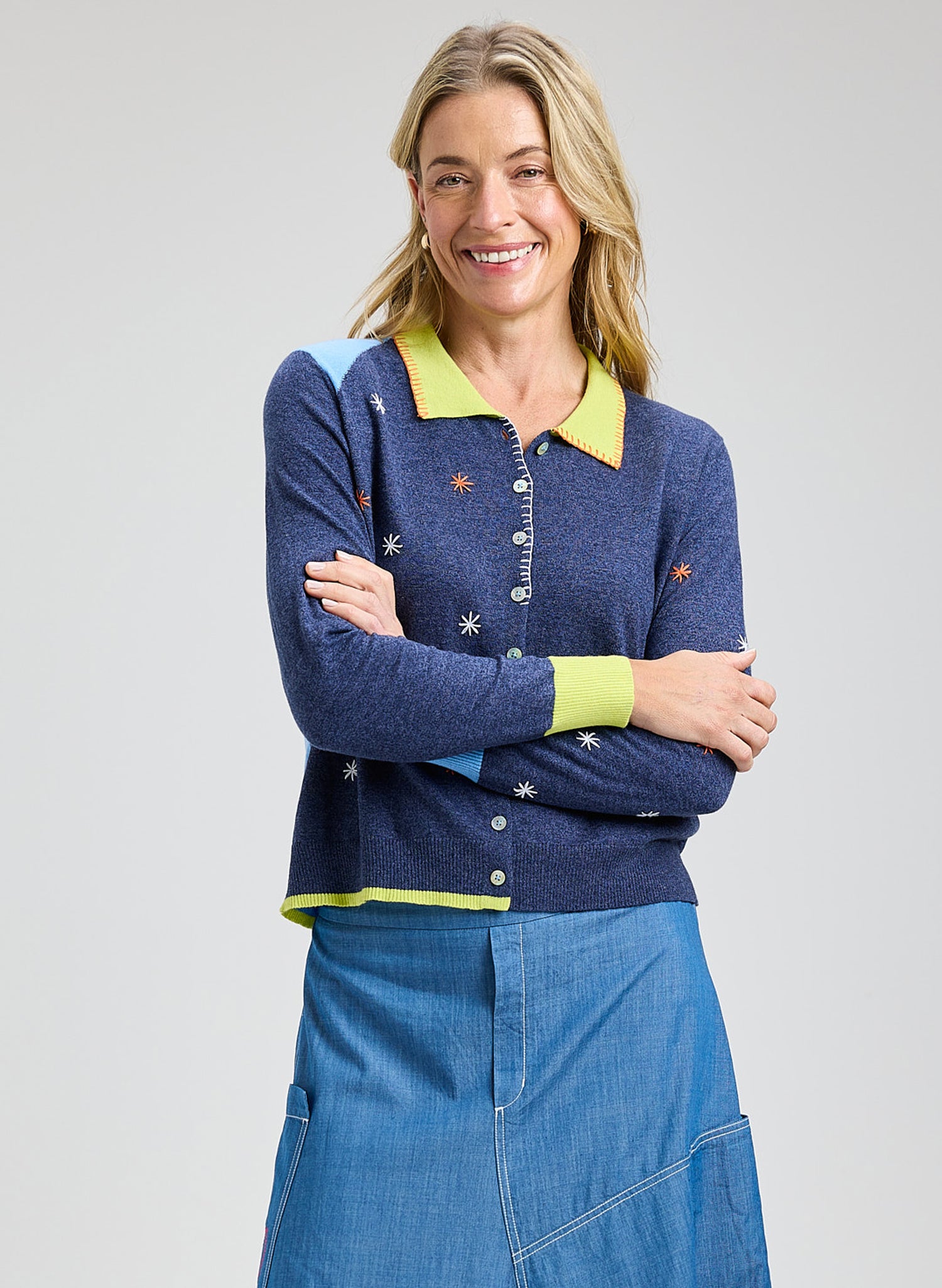 This denim cardigan from Zaket & Plover brings artisanal charm to everyday layering. Soft cotton-cashmere blend fabric drapes beautifully while hand-embroidered blossoms dance across the body and sleeves. Playful contrast trim at the collar, cuffs, and hem gives it a modern edge that feels fresh and unexpected. The relaxed fit makes it perfect for throwing over tees, dresses, or sweaters—lightweight enough for spring but cozy enough for cooler days. A wardrobe staple that doesn't feel ordinary.