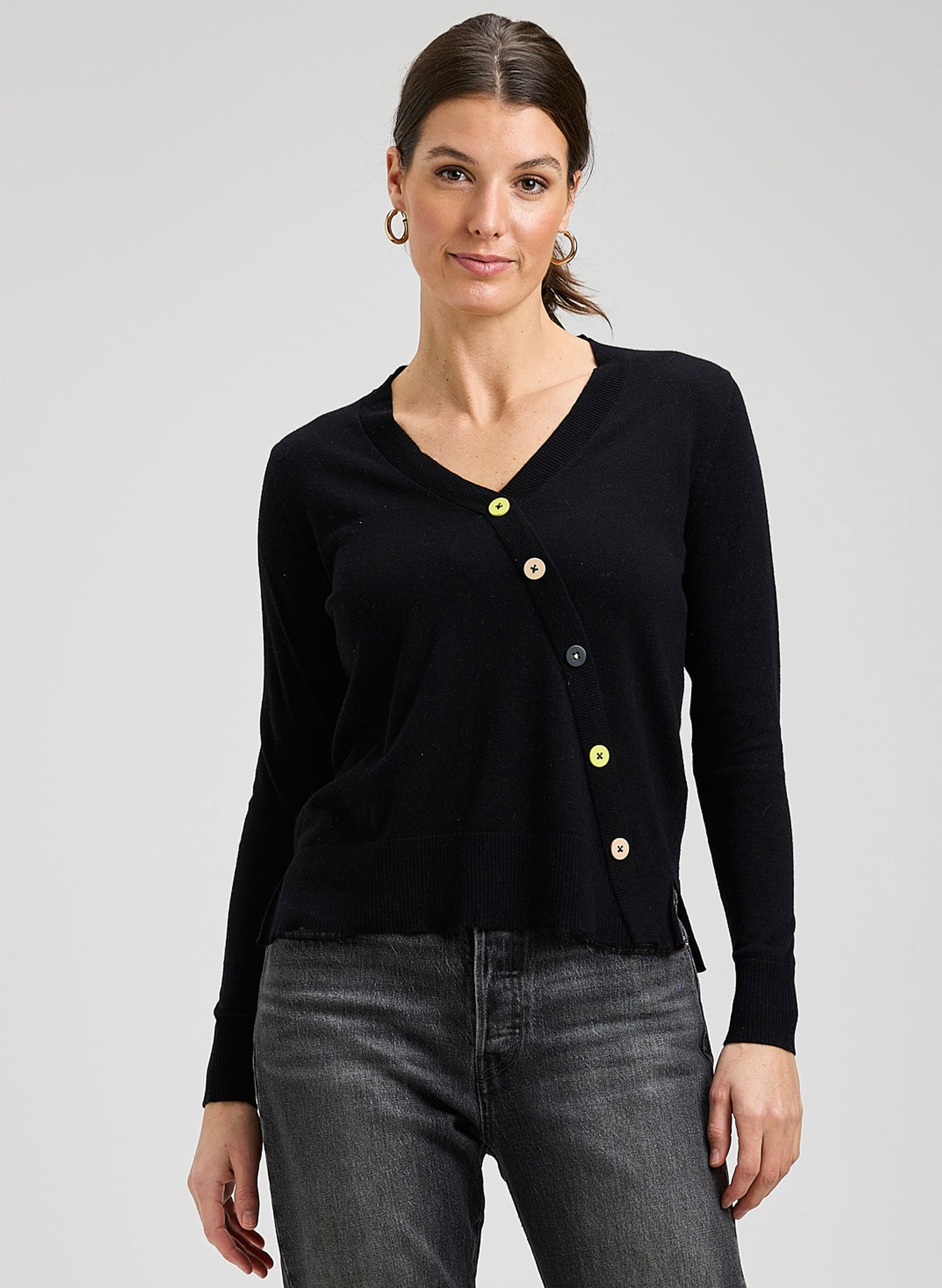 Sleek, modern, and effortlessly wearable, the Zaket & Plover Button Angle Sweater in Black puts a fresh spin on a classic knit. Crafted from a soft, lightweight blend, this sweater features an eye-catching angled button detail that adds subtle architectural interest without overpowering the look. The relaxed silhouette drapes beautifully, making it perfect for layering or wearing on its own. Timeless black keeps it endlessly versatile—easy to dress up with tailored pants or keep casual with denim. Thoughtful design meets everyday comfort in a piece you’ll reach for season after season. 100% Cotton.