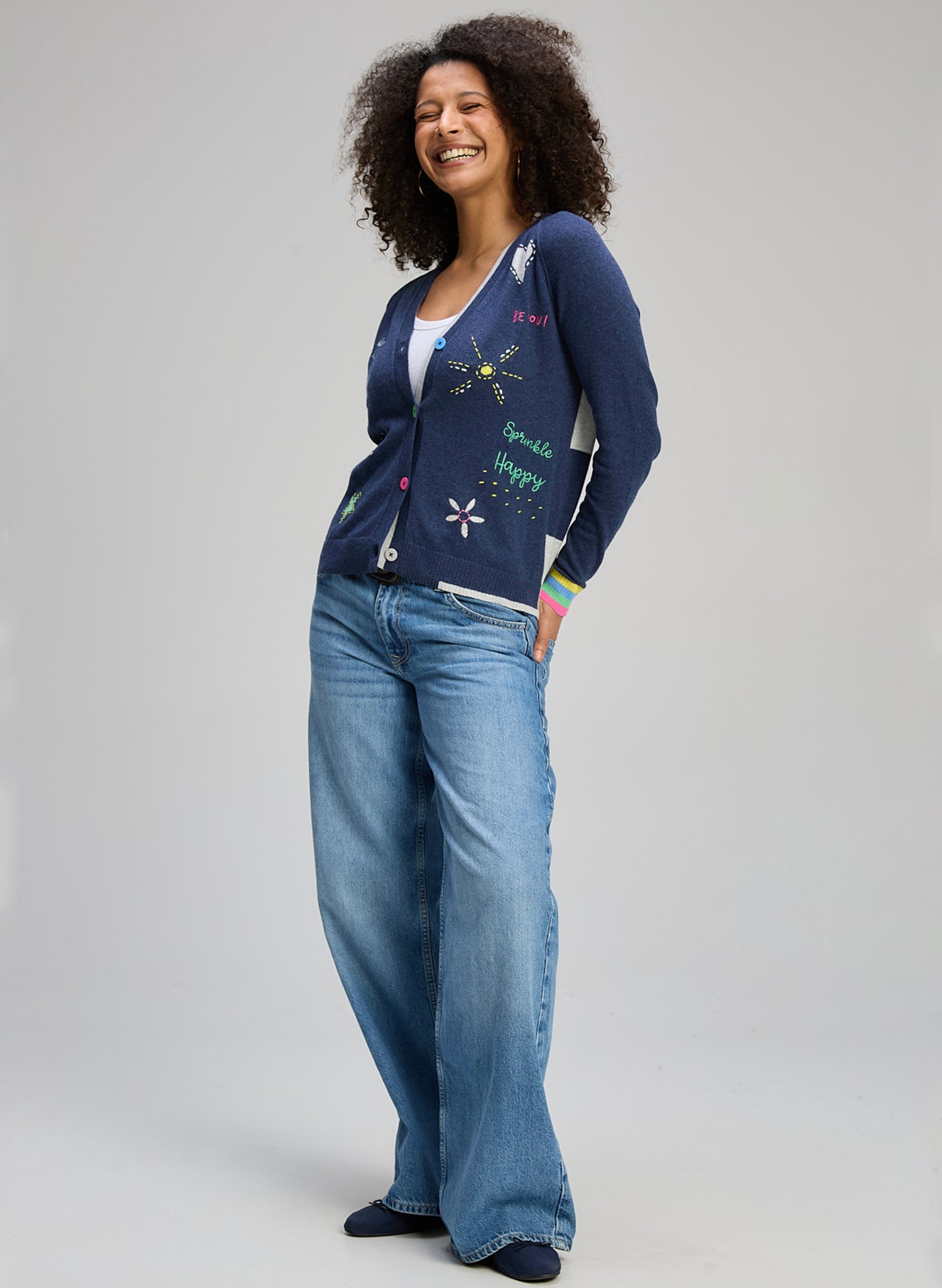This denim cardigan from Zaket & Plover brings instant joy with its embroidered "Good Vibes" design and charming contrast details. The relaxed V-neck silhouette features a button-front closure and long sleeves finished with playful cuff accents that catch the eye. Crafted from a luxurious cotton-cashmere blend, it's soft enough to wear all day while remaining beautifully lightweight. Style it over a simple tee and white jeans to showcase the whimsical embroidery, or throw it on over a casual dress for effortless weekend vibes. A fun layering essential that adds personality and warmth to any outfit.