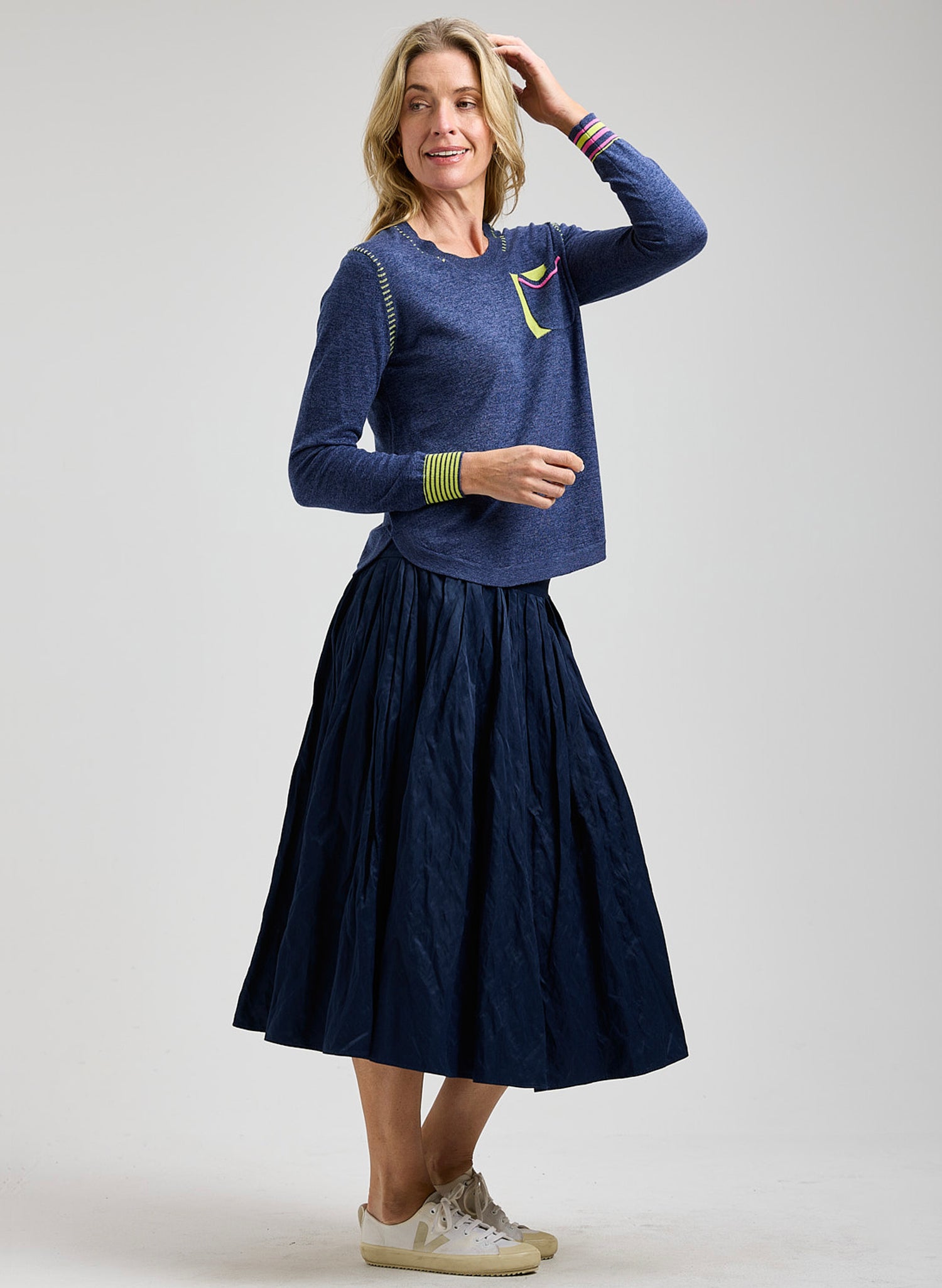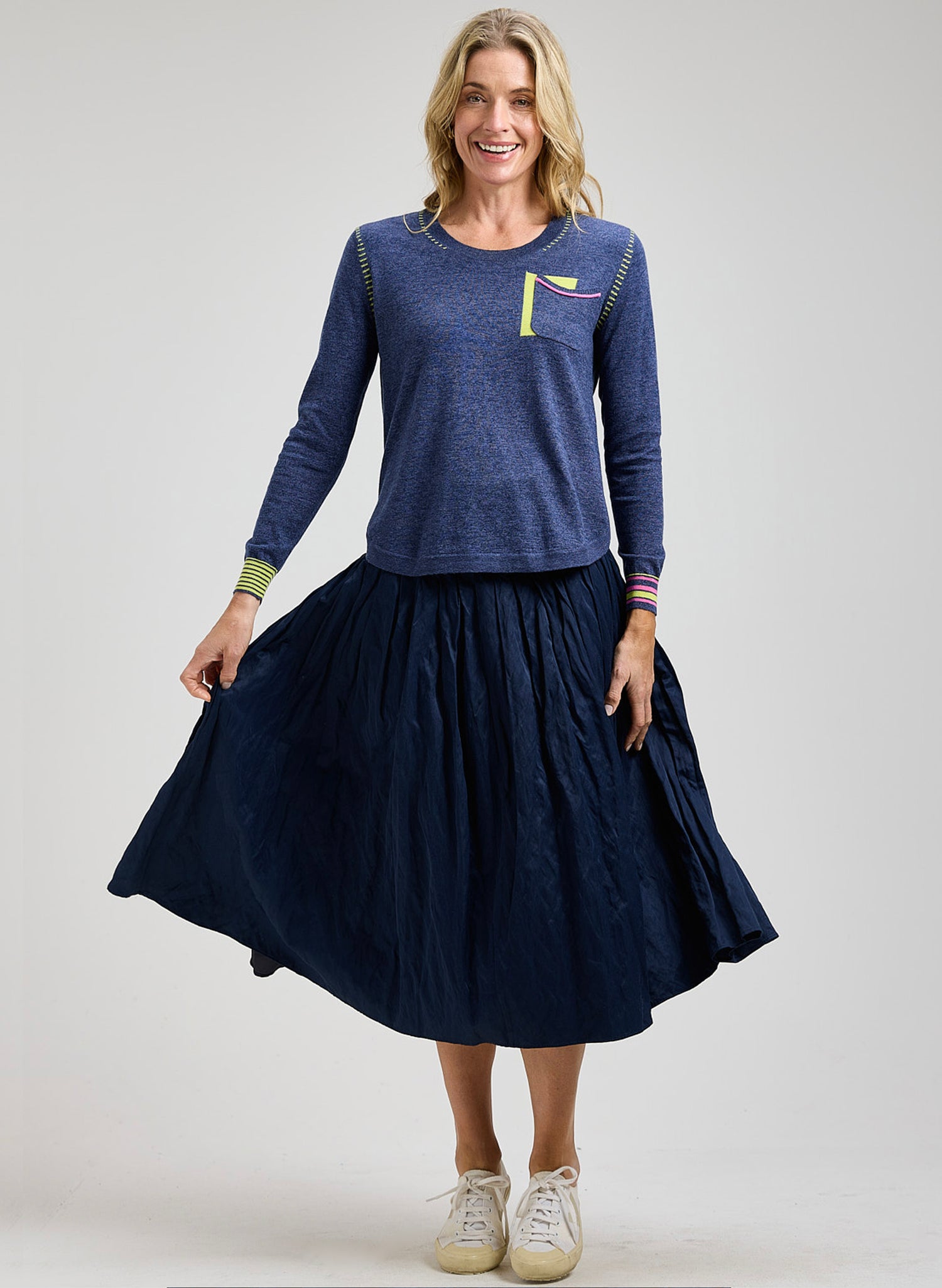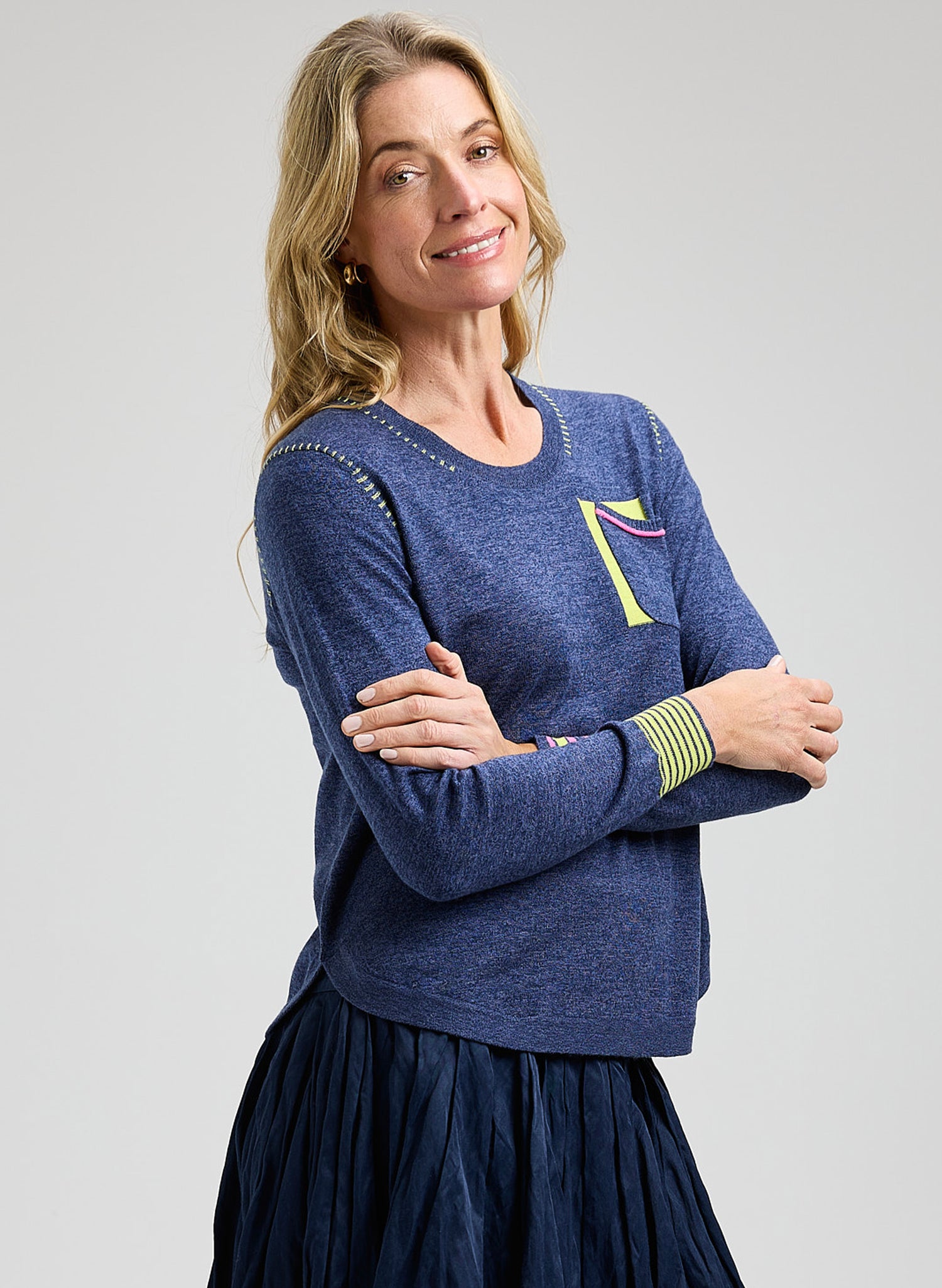 Meet your new spring essential: this Zaket & Plover sweater combines understated elegance with delightful surprises. The soft navy knit drapes in a modern cropped, boxy shape that pairs with everything in your closet. Look closer and you'll discover the charm—a striking contrast pocket, intricate embroidered accents, and vibrant striped cuffs that bring joy to every wear. Effortlessly chic and undeniably fun, it's the kind of piece that feels both polished and playful.