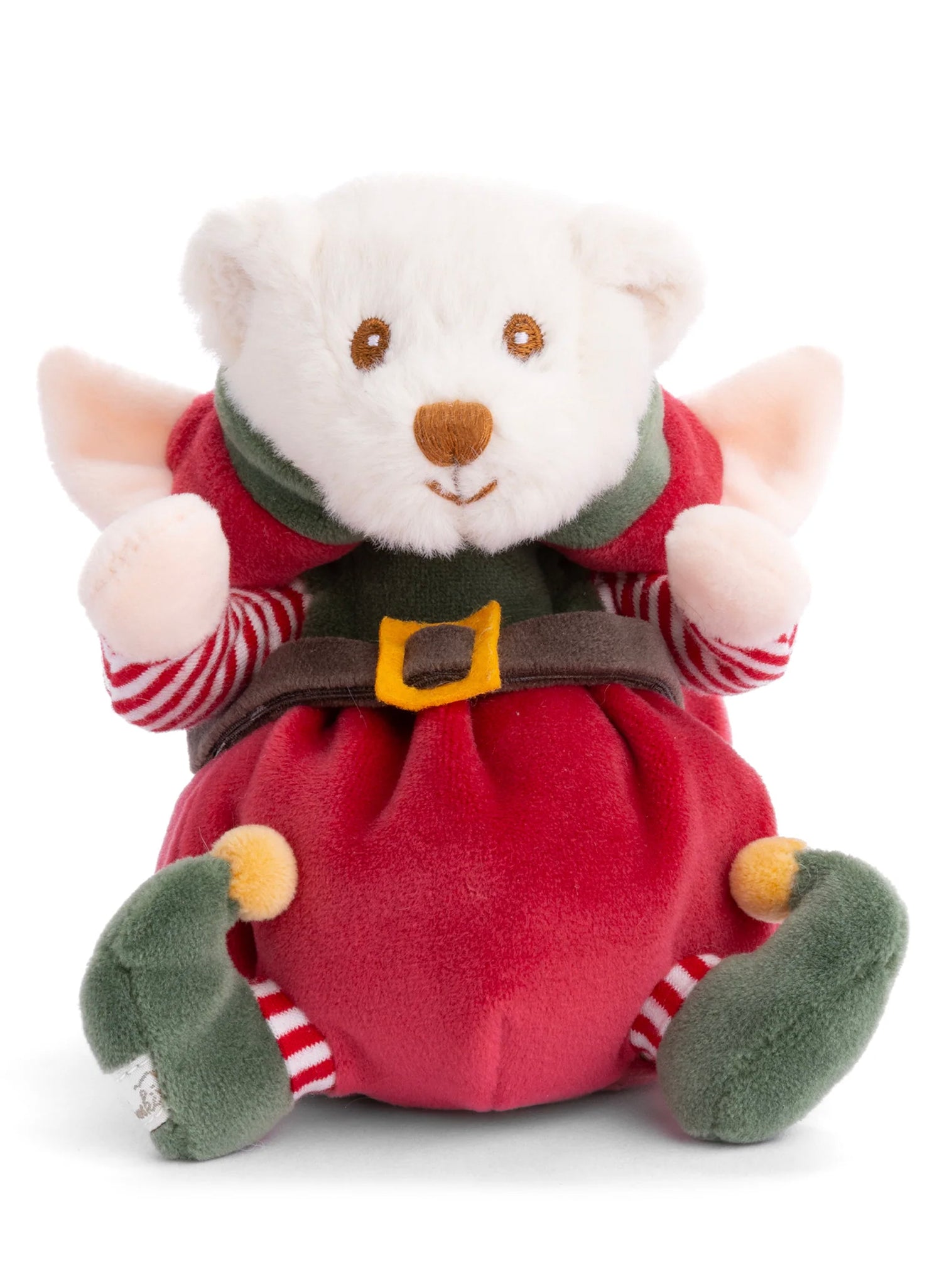 Introducing Ziggy, the merriest elf straight from Santa's workshop and ready to become your holiday companion! Crafted by Sweden's beloved Bukowski Bears, this plush character sports a vibrant red outfit complete with a jingling pom-pom hat, striped candy cane sleeves, and a shiny belt buckle. With his bright white face, sparkling embroidered eyes, and soft velvet paws and feet, Ziggy brings instant festive cheer to any room—perfect for snuggling through the season or displaying proudly on your shelf.